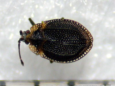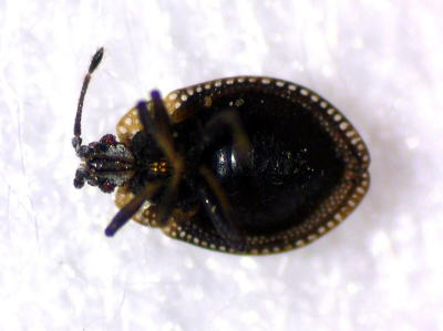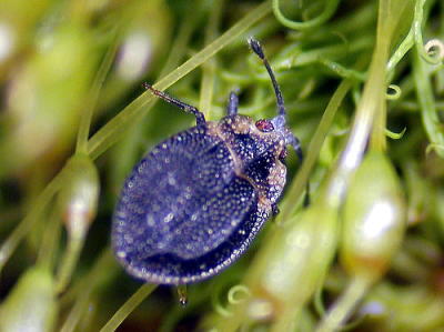 体長約2mm。 コケの中に隠れていました。 体は褐色または黒褐色ですが,前胸背の周辺部は広く淡褐色で,全体にやや強い光沢があります。 越冬のためだけにコケに潜んでいるのかと思いましたが,どうもコケから汁を吸って生きているようです。 本州・四国・九州に分布しているということですが,広島県昆虫誌には記載されておらず,これが広島県での初記録かもしれません。 写真はいずれも2022/02/26志田原で採集した蘚類(種名不明)の中にいたものを3/10に発見し撮影した。 |