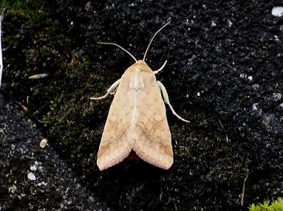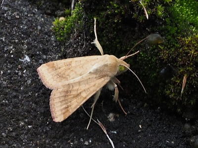 翅の地色は淡い灰褐色で,前翅は暗色の腎状紋と二重の点列からなる外横線の他は不明瞭です。