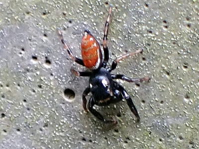 雄では眼域の後方が鮮やかな朱色で触肢には白毛があるる個体が多いそうですが,この特徴には個体差があるそうです。写真の個体は雄だと思いますが,朱色も白毛もほとんど見られません。