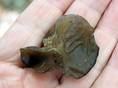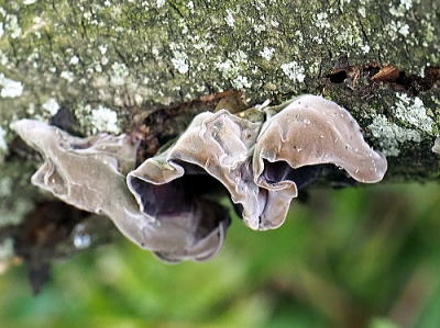 円盤状〜盃状〜耳状,背面の一部で基物につき,隣同士で癒着することもあります。 背面は直立した毛でおおわれますが,上のアラゲキクラゲほどにはわかりません。 本体はゼリー質で軟らかく,アラゲキクラゲがコリコリした食感だとすると,本種はプリプリという感じです。人工栽培もされており食材として利用されているようですが,アラゲキクラゲほどは出回っていないように思います。 今回は不明の地衣類とともに広葉樹の枯れ木についているのを見つけましたが,木の種類はわかりません。 写真はいずれも2025/05/27奥江 |