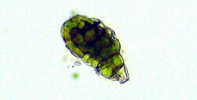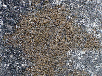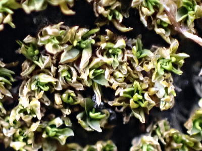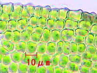 低地〜山地帯の日当たりのよい転石・石垣・コンクリート壁上などに生育します。 1段目の写真のように、コンクリー上に茶色い絨毯が敷かれたよう広がりますが、これは乾燥した状態です。ルーペでのぞくと、2段目のように葉が内側に向かって巻き込んでいます。これが雨が降って吸水すると3段目のように葉が広がり、離れてみると緑色に見えます。 葉は広楕円形〜広舌形で鈍頭、長さ1.5〜2mm。中肋は先端まで達します(4段目)。葉身細胞は丸みのある方形をしています(5段目)。 株を水に浸すと茎頂の葉に包まれている無性芽がこぼれ落ちます(6段目)。 写真は 1〜3段目2022/01/08 山北 |