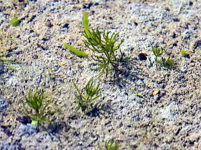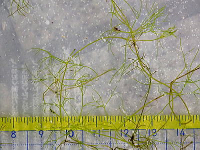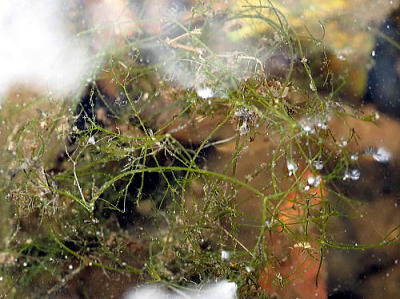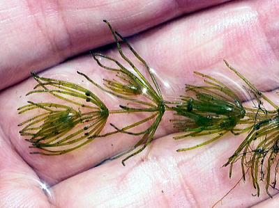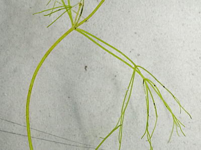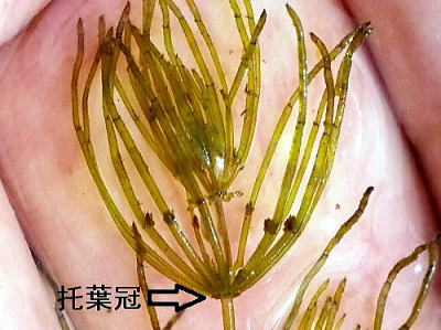 ため池に浮かんでいるのを見つけました。 シャジクモ科の仲間ですが,上のシャジクモとは別の亜科に分類されています。フラスコモ亜科ではシャジクモ亜科と違って主軸から出た小枝がさらに分岐します。また,小枝の付け根の下に,シャジク亜科では托葉冠という小さな突起がありますが,フラスコモ亜科にはこれがありません。 フラスコモの仲間は日本に複数自生していて,どれもよく似ているため分類が難しいそうです。また一部のフラスコモは淡水魚の水槽に観賞用に植えられるため,売られているようです。 写真は上2026/01/26志田原 |