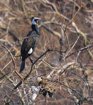 全長82cm。体はほとんど黒く、背と雨覆は茶褐色。くちばしの根元は黄色でその外側の裸出部は白い。繁殖期には顔白く細い羽毛が生えますが、個体により差が大きくほとんど生えないものもいるようです。 樹上に集団で営巣します。瀬戸池には大きなコロニーがありますが、枠田池でも下の写真のように営巣しているのが観察できます。また、瀬戸川にも多数の個体を確認できます。 鵜飼いのウはウミウで、本種ではありません。とてもよく似ていますが、ウミウは木にとまることは無いようですから、瀬戸町のものはカワウでしょう。 写真は左上下2009/02/07瀬戸池、 右下2010/05/08枠田池 |