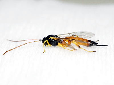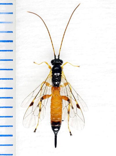体長8~13mm。 写真の個体は雌ですが,頭部,胸部および腹部の末端2節が黒色で他は橙赤色。 触角は赤褐色ですが,柄節は黒色。脚は腹部と同色ですが,後脚の腿節,脛節,跗節の先端は黒色になっています。 稲田付近に多くみられるということですが,今回はため池の堰堤に生えたアカマツの若木の周りを飛んでいました。フタオビコヤガ,イネドロオイムシなどに寄生するらしく,卵を産み付ける相手を探していたのかもしれません。 日本各地に分布し,広島県でも広い範囲に生息しているようです。 写真はいずれも2025/11/15 一番組採集個体 |