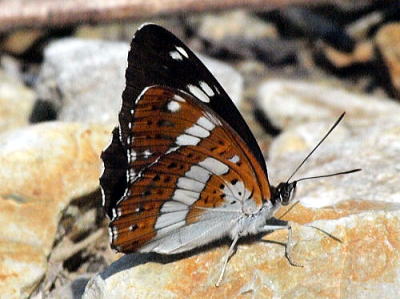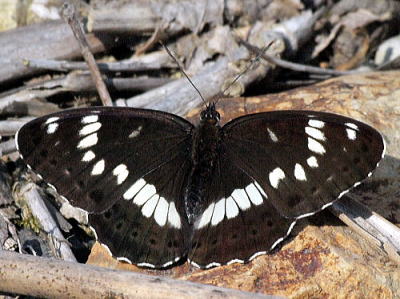 中型。表は黒色の地色で中央に1本の白色の帯が見られます。 そっくりな種にイチモンジチョウがありますが,この個体は前翅の中質の白斑がよく目立ちます。また,この個体は翅の裏面の色が明るいので雄と思われますが,前翅裏面の亜外縁中央の白斑が小さく不鮮明なことから,アサマイチモンジであるとしました。 東北地方から,山口県までの本州に分布し,平地から低山地の明るい樹林環境に生息します。 今回は一番組の池のほとりで見つけました。 幼虫の食草は,スイカズラやタニウツギなどでスイカズラやイボタノキなどの花を訪れます。 写真はいずれも2015/05/10一番組 |