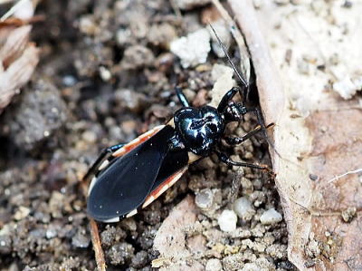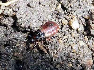 体長約11〜14mm。 体は藍青色を帯びた黒色に紅色,黄色の斑紋があります。半翅鞘の部分がビロウド状なのでこの名がついたようです。 下の個体は幼虫だと思われます。どちらも庭のプランターの下にいました。ネット上には,ヤケヤスデを狙っているという写真がありました。我が家の庭にはヤケヤスデはいくらでもいますのでそれらを餌にしているのかもしれません。 本州以南に分布しているそうですが,広島県では,中・西部からの記録しかないようです。福山市からはこれが初記録かもしれません。 写真は、いずれも2025/08/15高浦 |