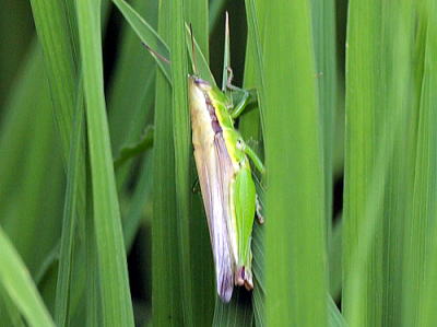 体長(翅端まで)雄36、雌43mm内外。 頭部の眼の後ろから胸部、前翅のたたんだ側面に太く黒い腺が目立ちます。下記のコバネイネゴによく似ていますが,よく見るとコバネイナゴの翅が腹端よりやや短いのに対して、本種では腹端より長いことで、区別がつきます。 イナゴ(稲子)の名の通り、イネの葉をよく食べ、下の写真のように群れています。ただ、イネしか食べないというわけではなく多種の植物の葉を食べるそうです。 本州中部以南に分布し、水田で多く見られます。 瀬戸町でも各所の水田で見ることができます。 写真いずれも2014/08/13志田原 |