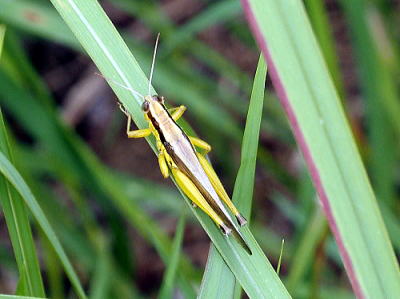 体長(翅端まで)雄25〜27mm、雌25〜32mm。 これも上記のハネナガイナゴとよく似ていますが,体の下半分の色が黄色みが強いですね。 写真を眺め,「もしかしたら別種かも?」と思って図鑑を見ていたら,イナゴモドキという種に行き当りました。前胸背板側縁から前翅基部〜中央に明瞭な黒色線状紋があるというところが見分けるポイントのようです。 食草はイネ科,カヤツリグサ科およびマメ科のヤブマメなどです。 北海道から九州まで分布し、どちらかといえば山地に多いようです。広島県でも沿岸部での確認はないようで,福山市からはこれが初記録かもしれません。 写真いずれも2025/09/09高浦 |