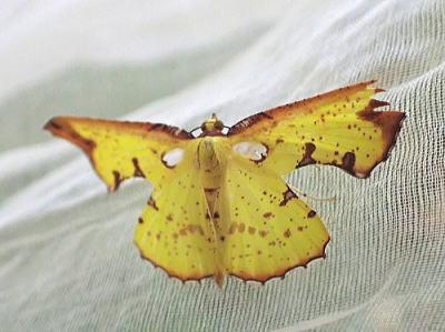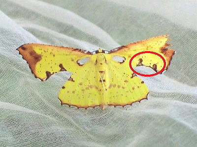 前翅長13〜16mm。 虫に食われた(あるいは破れた)木の葉が黄色く色づいたようです。擬態なのでしょうね。 雄の前翅の基部に透明な刻孔と呼ばれる部分があります。 ウコンエダシャクという,本種にそっくりな種がいますが,本種とは前翅の後縁にある褐色の斑紋の様子が違います。ウコンエダシャクでは内側の紋が大きいのに対して本種では外側の方が大きくなっています。 本州・四国・九州・対馬に分布していますが,広島県昆虫誌には広島市と廿日市市での記録しかありません。同定に間違いなければ,福山市ではこれが初記録かもしれません。 写真はいずれも2022/08/13彦山 |