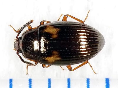 上翅基部に十字に近い黄色紋があります。背面は光沢があり,弱い金銅色を帯びています。