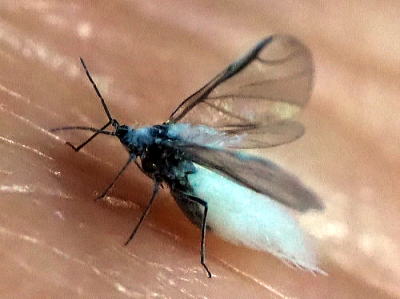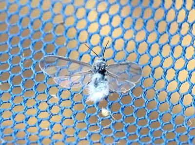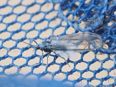 冬にふわふわと飛んでいたので雪虫の仲間だと思いますが,上のケヤキフシアブラムシとは別種のような気がします。 その理由は, @こちらの方が小さい(写真の網の目は直径1mmなので体長2〜3mmしかない)。 A翅の周縁が白く縁どられている。 ということで,雪虫と呼ばれる仲間にこの特徴に合う種を探してみたのですが,残念ながら他に合致するものが見つかりません。 ヒイラギハマキワタムシという種が翅の特徴は合うのですが,サイズはケヤキフシアブラムシより大きいということなので当てはまりません。 写真はいずれも2025/12/20高浦 |