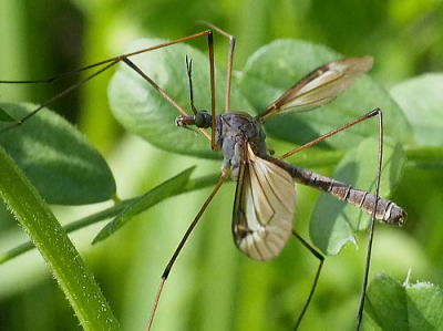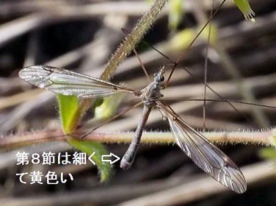 体長16〜17mm。 体は黒色。 中胸背に3本の黒褐色のすじがあり,中央のすじは,さらに細い黒いすじで二つに分けられています。 腹部の第8節が細くて黄色いのは特徴の一つです。 ガガンボの仲間は巨大な「カ」のように見えますが,カのように人を刺すことはありません。幼虫は,水の中で生活し植物の根から養分を吸うものもあって,中にはイネの害虫になっているものもいるようですが。 日本全土に分布しています。 写真はいずれも2019/04/16高浦 |