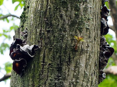 中華料理の食材としておなじみのキノコです。 円盤状〜盃状〜耳状,背面の一部で基物についています。かたいゼラチン質で,径6cm,高さ2cm以上になります。 背面は灰黄色〜灰褐色で,直立した毛に密におおわれています。 アカメガシワの枯れ木などによくつくキノコで,瀬戸町では見つけやすい食用キノコです。 近年は栽培品も売られているようです。 写真はいずれも2020/05/06枠田 |