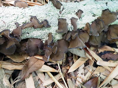 円盤状〜盃状〜耳状,背面の一部で基物につき,隣同士で癒着することもあります。 背面は直立した毛でおおわれますが,上のアラゲキクラゲほどにはわかりません。 本体はゼリー質で軟らかく,アラゲキクラゲがコリコリした食感だとすると,本種はプリプリという感じです。人工栽培もされており食材として利用されているようですが,アラゲキクラゲほどは出回っていないように思います。 今回は不明の地衣類とともに広葉樹の枯れ木についているのを見つけましたが,木の種類はわかりません。 写真はいずれも2025/05/27奥江 |