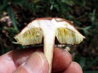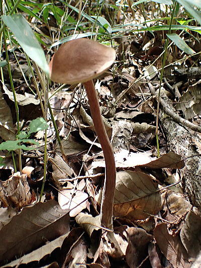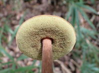 傘は径3〜5cmで,半円球〜まんじゅう形。表面は占めると少し粘性があり,色は栗褐色〜紫がかった茶褐色。 管孔は柄の周囲で陥没し,初めは黄色ですが,だんだん緑色になっていきます。 柄は長さ9〜23cm,太さ6〜12mmと細長く,基部付近で太まり一方に曲がります。 肉は淡黄色で,切断してもほとんど色は変わりません。 夏〜秋にブナ科(瀬戸町ではコナラ・アベマキ・アラカシなど)の木下に生えます。 日本とメキシコに分布しています。 写真はいずれも2025/09/27瀬戸池周辺の山 |