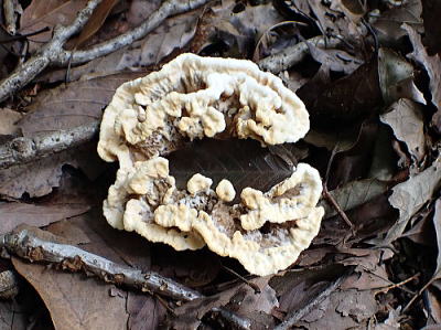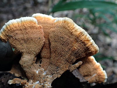 表面も下面も橙黄色〜橙褐色で縁は白色です。下面は細かい乳頭状のいぼで覆われています。