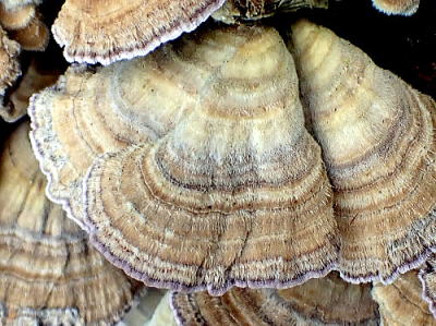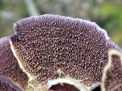 下面ははじめは浅い管孔状ですが,やがて孔壁の深く裂けた管孔状〜薄歯状となります。管孔部は帯紫色〜薄紅色又は類白色。