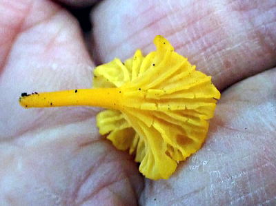 アンズタケかなとも思いましたが,アンズタケは傘の径が3〜8cmと大きく,傘の裏面のひだが互いに脈状に連結