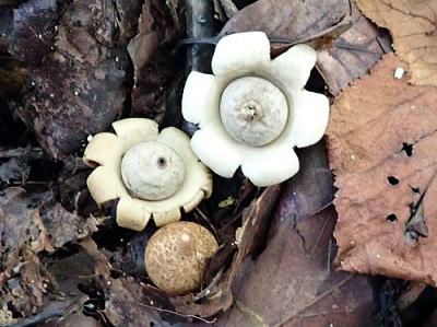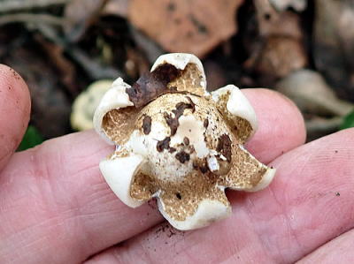 で球形ですが,次第に頂部がくちばし状をした直径1〜1.5cmの擬宝珠形になり,やがてその外皮が裂開して中から白いドングリのような子実体が現れます。