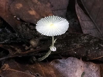 傘の径2〜4cm。円錐形〜鐘型からまんじゅう形となって,開いたら平らになります。中央部はややくぼむようです。表面の地色は白色ですが,放射状のすじがあって,ここの薄黄色の粉状鱗片がついているためにレモン色に見えます。 柄は高さ4〜8cm,径2〜3mm。根本は膨らんで中空になっています。 全体的にもろいので,少し力を入れてもつと簡単にくずれます。 夏〜秋に林内,庭園内,温室内などに発生します。日本で林内に発生することが多いようで,今回も雑木林の中で見つけました。 下段の写真は竹林内で撮影したものです。きれいに開いていました。 写真は上・中 2022/10/08枠田 下2024/06/30猪之子 |