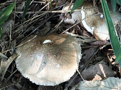 傘は径3〜11cm。幼時は卵形から鐘形ですが,開いてまんじゅう形から平らとなり,ついには多少中央がくぼむようになります。表面は帯灰褐色で,時にややかすり模様を表し,しばしばつぼの薄片が付着しています。ひだは白色,密で離生です。 柄は長さ5〜12cm,径6〜18mm。白色で表面がややささくれ,上部には膜質のつばが,基部には袋状のつぼがあります。 夏〜秋,シイ・カシ林,クヌギ・コナラ林,アカマツ・コナラ林などの地上に発生します。 本州以南に分布しています。 写真はいずれも2022/10/16猪之子 |