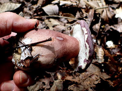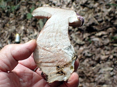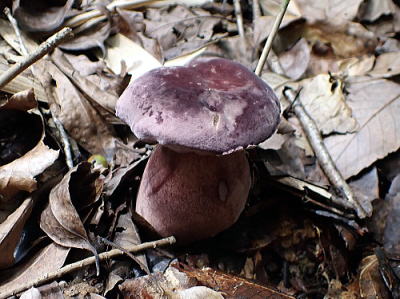 傘は径6〜8cmで,表面は濃紫色でビロード状でした。 管孔は白色。 柄は長さ約10cmで径は太いい部分が傘と同じ程度まであり,布袋形という感じです。 切断面は徐々に紫褐色に変わっていきました。 この特徴から手持ちの図鑑で調べてみたのですが,ぴったり当てはまるものがなく,ネット上の写真からクロムラサキニガイグチが最も近いと判断しました。 クロムラサキニガイグチは2007年に種として提唱されたもので日本ではあまりないようです。シイの木の林に生えると書いたものもありましたが,今回確認した場所にはシイと同じブナ科のコナラは生えていましたが,シイはありませんでした。 写真はいずれも2025/09/27瀬戸池北側の山中 |