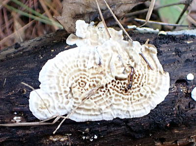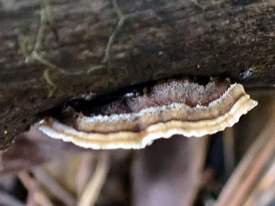 ごくわずかに見られた傘は半円形で,背面にはカワラタケのような同心円状の模様がありました。厚さは1mmあるかどうかで薄かったです。