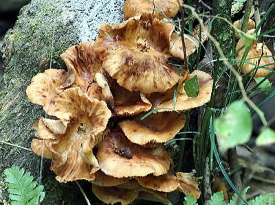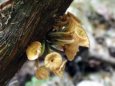 傘は径4〜15cm。 表面は帯黄色,淡黄褐色,帯褐色などがあり,中央部に細かい鱗片,周辺には放射状の条線があるということですが,今回見たものでは,中央部の細かい鱗片はよくわかりませんでした。 ひだは多少垂生し,白色から後に淡褐色のしみを生じます。ります。 柄は径5〜15mm,長さ4〜15cm,下部がやや膨らみ繊維質で,淡褐色〜帯褐色。上部に白〜帯黄色のつばがあります。 広陽樹および針葉樹の枯れ木上に群生または束生します。 ほとんど全世界に分布しているそうです。 写真はいずれも2024/10/31彦山 |