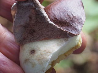 傘は径5〜15cm,表面は粘性に富み,暗赤褐色〜黄褐色。落ち葉などがよくくっついています。裏面はイグチ科の特徴である管孔を持ち,レモン黄色〜帯褐黄色。管孔は小さい。肉は白〜淡レモン色。傘の皮が容易にはがれるのも特徴の一つです。 柄は上部につばを持ち,表面は白〜淡黄色の地に細粒点が密にあります。 夏〜秋,マツ属またはトウヒ属林内の地上に群生します。日本全国のマツ林に最も普通に見られる種類ですが,マツが減った瀬戸町では,多くはありません。今回は彦山に残るマツの木の下で見つけました。 イグチ科のキノコは毒を持つものが少なく,傘の裏がヒダではなく管孔ということで見分けやすいため各地で食用にされています。本種はその代表ですが,イグチ科の中にも有毒種が見つかっており,安心はできません。これは絶対大丈夫と見分けられるまではむやみに食べない方が無難だと思います。 写真はいずれも2020/11/09彦山 |