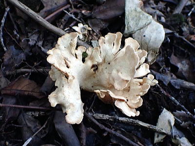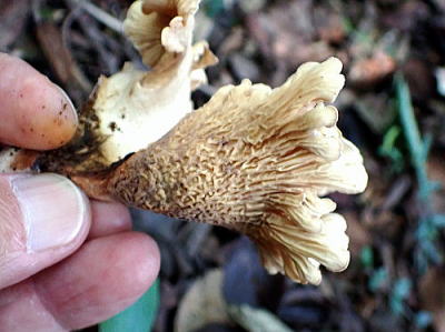 高さ10cm内外で,全体が肉質。下面の子実層托は低いしわ状。色は,初めは白ですが,胞子が熟するにしたがってクリーム色になっていきます。