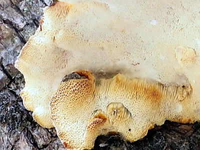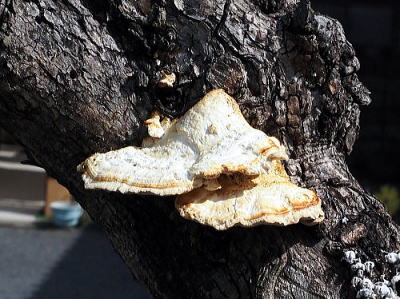 手持ちの図鑑に記載されている中ではシロカイメンタケが最も近いと思いますが,自信はありません。 シロカイメンタケの特徴と比較したいと思います。 傘は半円形で扁平,幅10〜20cm,厚さ1〜3cm・・・これは合っています。 表面は初め鮮橙色〜帯黄紅色でビロード状,後に汚白色・・・これもあっていると思います。 孔口は小さく不整円形。これは,下の写真を見るとあっていない気がします。 ナラ・カシ類(ブナ科)の枯れ木に生える・・・この写真の木は柿の木ではなかったかと思います。ブナ科ではありません。 と,いうことで確定できないので?をつけています。 写真はいずれも2025/09/14元枝 |