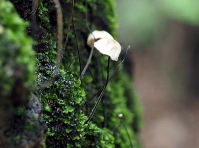 この髪の毛状の柄(根状菌糸束というそうです)の様子から「ヤマンバノカミノケ」という別名もあります。傘がない時に見た時には本当に気味が悪かったです。