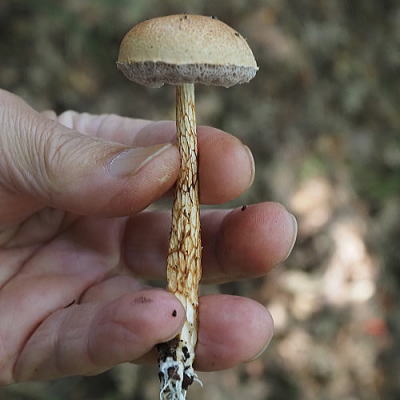柄は細長く,表面は白〜淡黄褐色で褐色・縦長の網目があります。肉は白色です。