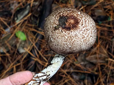 傘は径7〜20cm。初めは半球形で,広まんじゅう形からほぼ平らに開きますが,中盤部は最初から平坦です。 表面は初めは一様に帯紫褐色の繊維に密におおわれていますが,傘が開くにつれて表皮が裂けて鱗片を生じ帯白〜淡ピンク色の地肌が出てきます。ただし,中盤部は暗紫褐色のままで鱗片は生じません。 肉はやや厚く白色で成熟すると多少紫褐色を帯びます。 ひだは隔生で初めは白色ですが,ピンク色から黒褐色に変わり,かなり密です。 柄は長さ9〜20cm,径1〜2cmで下に行くほど太まり,白色です。上部はのちに淡紅色を帯び,つばより下は綿くず状のささくれに包まれます。 つばは柄の中部〜上部について大型で白色です。 夏〜秋に種々の林内の地上に群生します。 日本と北アメリカに分布しています。 写真はいずれも2022/10/10彦山 |