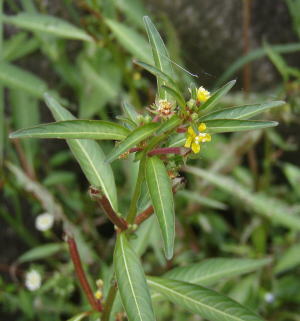 別名アメリカミズキンバイ。北アメリカ原産の高さ50cm程になる1年草。 瀬戸町内の水田に近年増えてきているようです。 葉は披針形で尾状に尖り、基部は茎に流れて翼になります。 チョウジタデに近縁ですが、花は直径2.5cmほどと大きく、美しい黄色をしており、よく目立ちます。 花期8〜10月 |