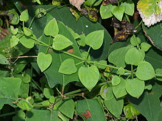 つる性で,長く伸びます。茎はよく分枝し,下向きのとげがあります。 葉は長さ3〜7cmの三角状卵形または狭卵形で先端はしだいに細くなってとがります。基部は心形です。4個が輪生しているように見えますが,そのうち2個は托葉が発達したものだそうです。 花期は8〜10月で,黄緑色の直径3〜4mmの小さな花が集まって咲きます。 果実は直径5〜7mmで黒く熟します。 アカネとは「赤根」の意味で,根を掘るとオレンジ色をしています。これを乾かすと赤紫色になり,うすでついて煮出した液で染めると茜色に染まります。 写真は上,中2015/10/25一番組 下2013/5/16一番組 |