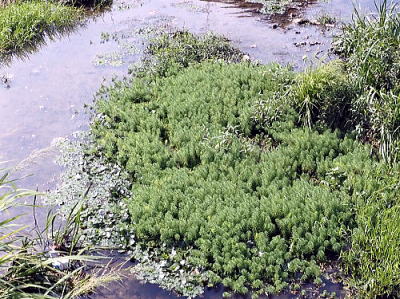 ブラジル原産の多年性水生植物。 大正年間に観賞用の水草として導入されたらしいのですが,今では各地の河川にはびこり,特定外来生物に指定されています。 芦田川水系ではかなり以前から確認していましたが,今回瀬戸川でこの群落を見つけました。 円柱形で赤紫色した根茎から茎を伸ばし,長さ1mほどになります。空気中に伸びた茎には糸状に裂けた無柄の葉が3〜7枚輪生しています。 花期は春〜夏で,葉の基部に2mmほどの小さな花をつけます。日本で広がっているものは雌株だけです。 写真はいずれも2025/09/14瀬戸川(元枝) |