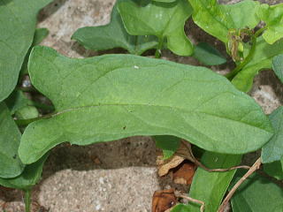 日当たりのよい野原や道端などに生えるつる性の多年草。 瀬戸町では川土手などに普通に生えています。 アサガオと同じような花ですが、こちらは昼間に咲くのでヒルガオです。 よく似た種にコヒルガオというのがあるそうで、瀬戸町に生えている種がどちらなのか判断に迷うところです。 コヒルガオでは花柄に翼があり、ヒルガオの花柄には翼がない(写真中)ということが最も顕著な違いということで、今回はヒルガオとしました。 しかし、葉の形ではヒルガオでは基部の耳の部分が裂けない(写真下)のが普通のようですが、中には裂けているようなものもあって、コヒルガオかなと思えたりもします。 今後さらに詳しく観察していきたいと思います。 花期6〜8月 写真は上、中2008/06/09 下2009/05/30 いずれも高浦 |