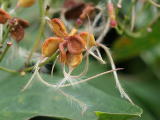 果実の長い毛(めしべの変化したもの)を仙人のヒゲにたとえたもの(写真下)。 道端や林縁など日当たりの良いところに生えるつる植物で、瀬戸町内では川沿いに多く見られます。 茎や葉に皮膚にかぶれをおこす有毒物質を含むので、汁を直接皮膚につけてはいけません。 葉は3〜7個の羽状複葉。小葉は厚くてやや光沢がある3〜7cmの卵形または卵円形。 花は白くよく目立ちますが、花びらのように見えるものは実は萼片で4個あります。 花期は8〜9月 写真上2008/09/17志田原、 下2008/11/02志田原 |