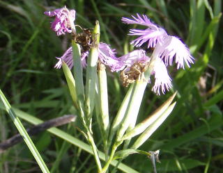 秋の七草の一つ。 山野の日当たりのよい草地や河原に生える高さ30〜60cmの多年草。 瀬戸町内ではある溜め池の土手でのみ確認しています。2009年までは複数の株がありましたが、2010年には1株 しか確認できませんでした。 毎年の草刈りの時期も影響すると思われますが、減少しているのはまちがないでしょう。できれば保護したいものです。 葉は長さ3〜9cmの線形〜被針形。 花は淡紅紫色で直径4〜5cm。花弁が細かく糸状に裂けるのが特徴。萼筒(がくとう)は3〜4cmと長く、その下に3〜4対の苞(ほう)があります。 花期7〜10月 写真上,下2009/07/24、 中2008/08/12 |