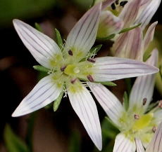 日当たりの良い草地に生える、高さ20〜25cmになる多年草。 瀬戸町では彦山で確認しています。 全草に苦みがあり、千回振っても苦みが無くならないからと名付けられたそうです。 健胃薬として古くから使われています。 葉は対生し、長さ1〜4cmの細長い線形。 花は直径2〜3cmで5深裂し、裂片は白色で紫色の筋があります。 花期9〜11月 写真はいずれも 2010/11/03彦山 |