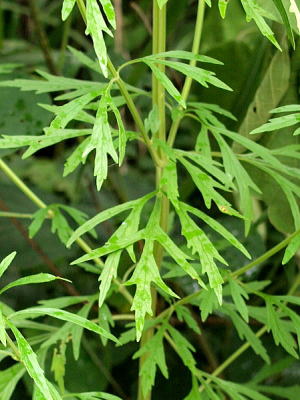 全体に白い毛が密生しており、茎葉は長さ5〜10cmで深く3列し、裂片はさらに羽状に切れ込んでいます(右下)。