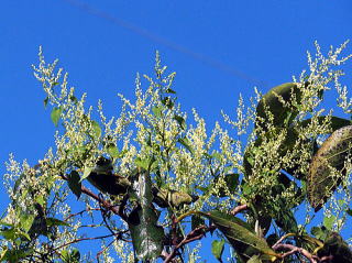 中国原産の多年草。つる性で他の樹木などに絡んで伸びます。上の写真は柿の木のてっぺんで開花している様子です。 名前はツルドクダミですが,ドクダミの仲間ではありません。葉は長さ3〜7.5cmの卵形で先が尖りますが,その形がドクダミの葉に似ているというだけです。実はイタドリに近縁の植物で,花の様子はイタドリそっくりです。 イタドリは雌雄異株ですが,本種は雌雄同株で,一つの花序に雄花と雌花が混じって咲きます。花の色は緑白色で,ときには紅色かかることもあるようです。 江戸時代に薬用として入ったものが各地で野生化しているとのことです。本種の塊根(いも)を乾燥したものを「カシュウ」というそうです。薬効は「血中コレステロール低下,血糖降下,感染症予防」などがあるようで,現在でも生薬として利用されているそうです。 花期8〜10月 写真はいずれも2021/10/01志田原 |