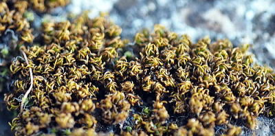 低地〜山地帯の日当たりのよい転石・石垣・コンクリート壁上などに生育します。 1段目の写真のように、コンクリー上に茶色い絨毯が敷かれたよう広がりますが、これは乾燥した状態です。ルーペでのぞくと、2段目のように葉が内側に向かって巻き込んでいます。これが雨が降って吸水すると3段目のように葉が広がり、離れてみると緑色に見えます。 葉は広楕円形〜広舌形で鈍頭、長さ1.5〜2mm。中肋は先端まで達します(4段目)。葉身細胞は丸みのある方形をしています(5段目)。 株を水に浸すと茎頂の葉に包まれている無性芽がこぼれ落ちます(6段目)。 写真は 1〜3段目2022/01/08 山北 |