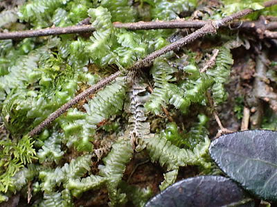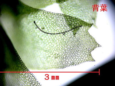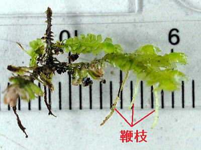 茎は長さ12cmまで達しますが,見かけ上二叉状に分かれて伸びます。腹面から鞭枝と呼ばれる,一見根のような枝をたくさん出しています。 葉は倒瓦状に密に重なり,やや内曲しています。長さは2.5〜3.5mmで先端に3歯があります。 腹葉は茎に接してつき,円状方形で,扁平,先端が重鋸歯状になっています。よく似たコムチゴケでは,全縁ないし鈍波状です。また,本種の腹葉の細胞はほとんど色が無く,透明ですが,コムチゴケの腹葉は全体が緑色です。 本州〜沖縄の低地の林床,岩上,樹幹上に生えます。 写真1段目は2025/12/22瀬戸池南側林中 |