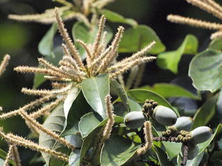 高さ15m,直径50cm程になる常緑高木。 近畿以西の本州から沖縄まで分布し,広島県では,沿岸部と島嶼部に分布しています。主に谷から山腹に生育し,尾根筋にはあまり生えないようです。 瀬戸町では,瀬戸池より北の一番組と彦山周辺に多くあります。 葉は互生,長さ6〜14cm,幅3〜5cmの倒披針状長楕円形で厚い革質。ほとんど全縁ですが,上部にわずかに鋸歯があることもあります。 果実はドングリで,果実のそこが少しへこんでいるため,シリブカの名が着いたそうです。また,本種はカシの名がありますが,シイ属に属し,アラカシなどのコナラ属の果実と違って,果実は渋味が少なく,生でも食べられるそうです。 本種は,一番の特徴は,秋に花を咲かせることです。他のカシやシイの仲間はすべて春から初夏にかけて花をつけるので,秋にクリの木のような花を見つけたら,間違いなく本種です。 写真はいずれも2012/09/23一番組 |