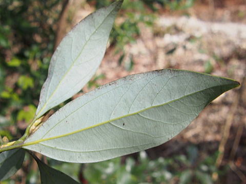 高さ10mほどになる常緑高木。 関東地方南部以西の本州,四国,九州の山地のやや乾いたところに多いそうです。広島県内では,西部の沿岸部で確認されていますが,東部には記録がないようです。 今回,グリーンラインから彦山山頂へ至る道のわきに高さ約2mの若木を発見しました。 葉は互生。長さ5〜12cm,幅2〜4cmの倒卵状長楕円形です。表面は光沢があり,裏面は白色です。ヤブニッケイの葉に似ています。 雌雄異株で,花は3〜4月,小さな暗紅紫色の花が密集して付きます。このような花は日本の樹木で他にはないようです。 今回確認したのは,雌株のようで花の中心に白い柱頭が目立ちます。 果実は長さ1cmほどの楕円形〜長楕円形で10〜11月に黒紫色に熟します。 写真はいずれも 2018/04/01彦山 |