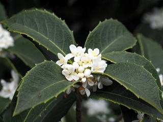 花は白色で直径8〜10mm、4裂した花弁が反り返っています。キンモクセイほどではありませんが、よい香りがします。